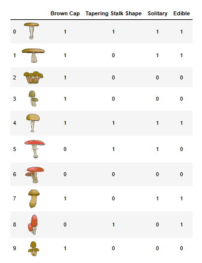 - 数据包含 10 个蘑菇样本,每个样本有 3 个特征: